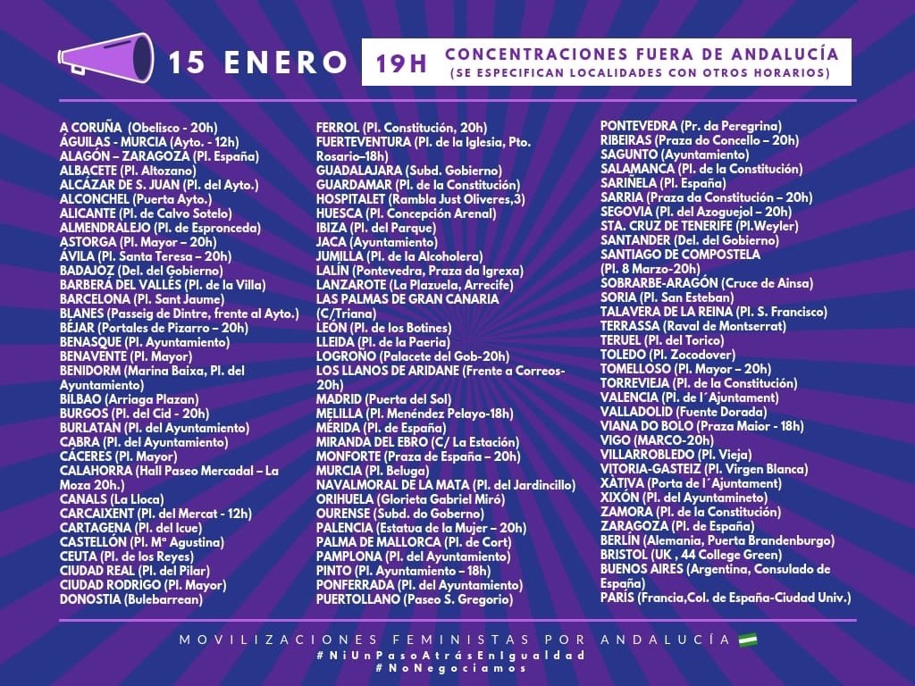 Las protestas responden a un llamamiento realizado por las organizaciones de mujeres de Andalucía, ante el pacto que incluye acuerdos que perjudican de manera directa los derechos de las mujeres. Las concentraciones y manifestaciones que recorrerá el país tendrán lugar mientras se celebra en el Parlamento Andaluz, por eso una de las primeras manifestaciones tendrá lugar a las 12:00 en las puertas del Parlamento de Andalucía en Sevilla, coincidiendo así con el inicio del debate de investidura del candidato del Partido Popular.