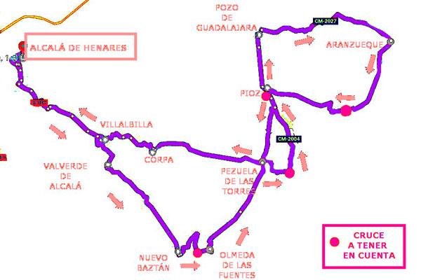 Saldrán de la misma Plaza de Cervantes para pasar por Valverde de Alcalá, Nuevo Baztán, Olmeda de las Fuentes, Pezuela de las Torres, Pioz, Pozo de Guadalajara, Aranzueque, Corpa y Villalbilla para volver a Alcalá de Henares.