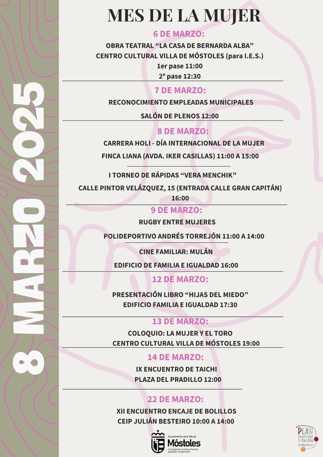 El Ayuntamiento de Móstoles ha elaborado una extensa programación para celebrar el Día de la Mujer, que se conmemora el 8 de marzo. Desde la Concejalía de Juventud, Familia, Igualdad y Cooperación se han planificado actividades que empiezan desde el día 6, como es el caso de la obra teatral “La Casa de Bernarda Alba”, dirigida a los Institutos de Enseñanzas Secundarias, que tendrá lugar en el Centro Cultural Villa de Móstoles en dos pases: a las 11 y a las 12:30.