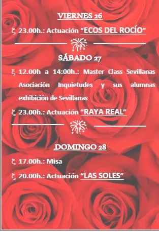 El día 26 de abril, desde las 23:00 horas habrá una actuación del grupo Ecos del Rocío, una formación gaditana que nació en 1984 con las sevillanas como su mejor forma de presentación.