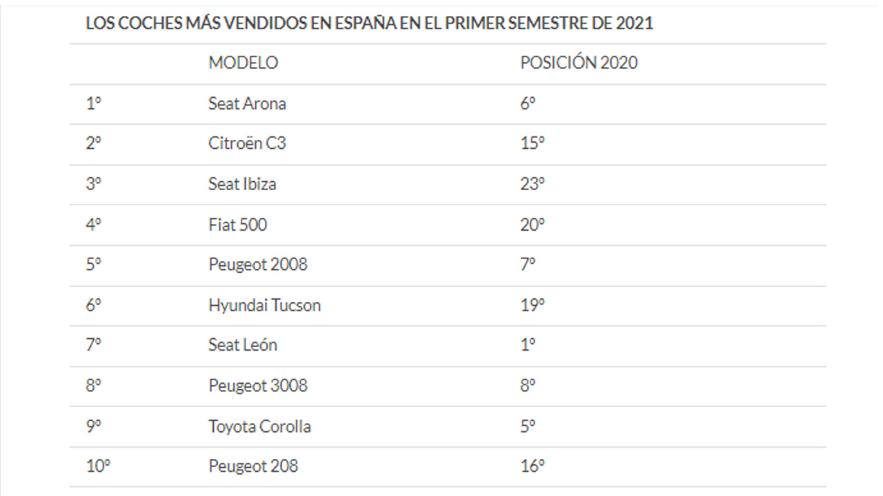 En cuanto a los automóviles que ocupaban puestos destacados en esta lista de modelos más vendidos, muchos han salido de ella en estos meses. Dejando de estar entre las preferencias de los compradores el Dacia Sandero, Nissan Qashqai, Renault Clio, Renault Captur y Hyundai Kona. En cambio, entran pisando fuerte en el top 10 Citroën C3, Seat Ibiza, Fiat 500, Hyundai Tucson y Peugeot 208.