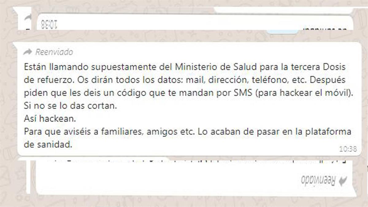 Hemos estado investigando, y ni el Ministerio de Sanidad ni la Policía tienen constancia de esta supuesta estafa. Si bien, el Ministerio también ha confirmado que no están haciendo este tipo de llamadas para citar o informar sobre la tercera dosis. Por tanto, es cierto que no se está ofertando la vacuna de esta manera, y si te llaman se trata de un engaño, pero tampoco constan denuncias de intento de hackeo similar al que se explica ne el mensaje.
