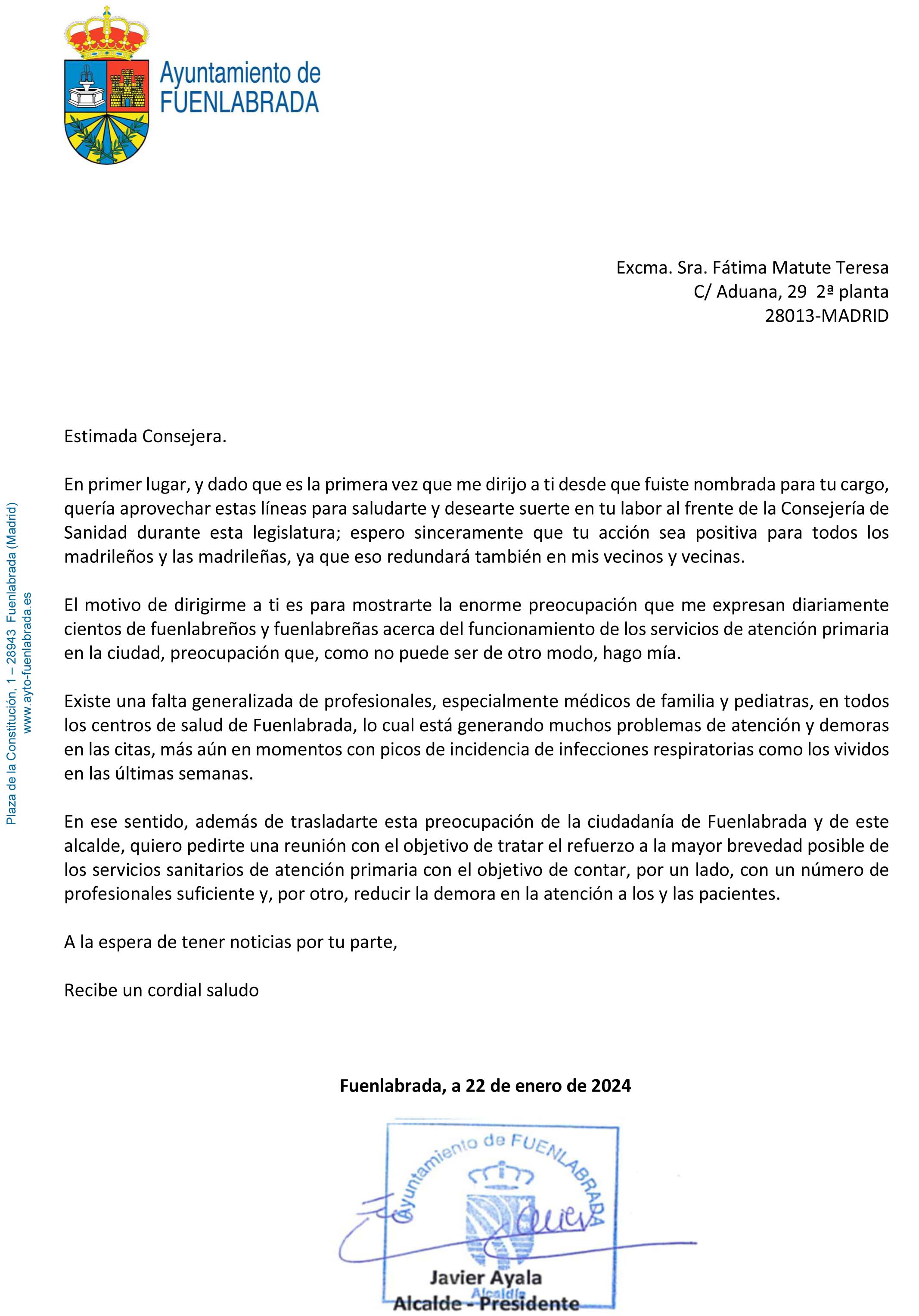 El alcalde de Fuenlabrada, Javier Ayala, ha enviado una carta a la consejera de Sanidad de la Comunidad de Madrid, Fátima Matute Teresa, para expresarle su preocupación por los problemas de personal médico en los distintos Centros de Salud de Fuenlabrada lo que está provocando que los ciudadanos tengan que sufrir demoras en sus citas médicas.