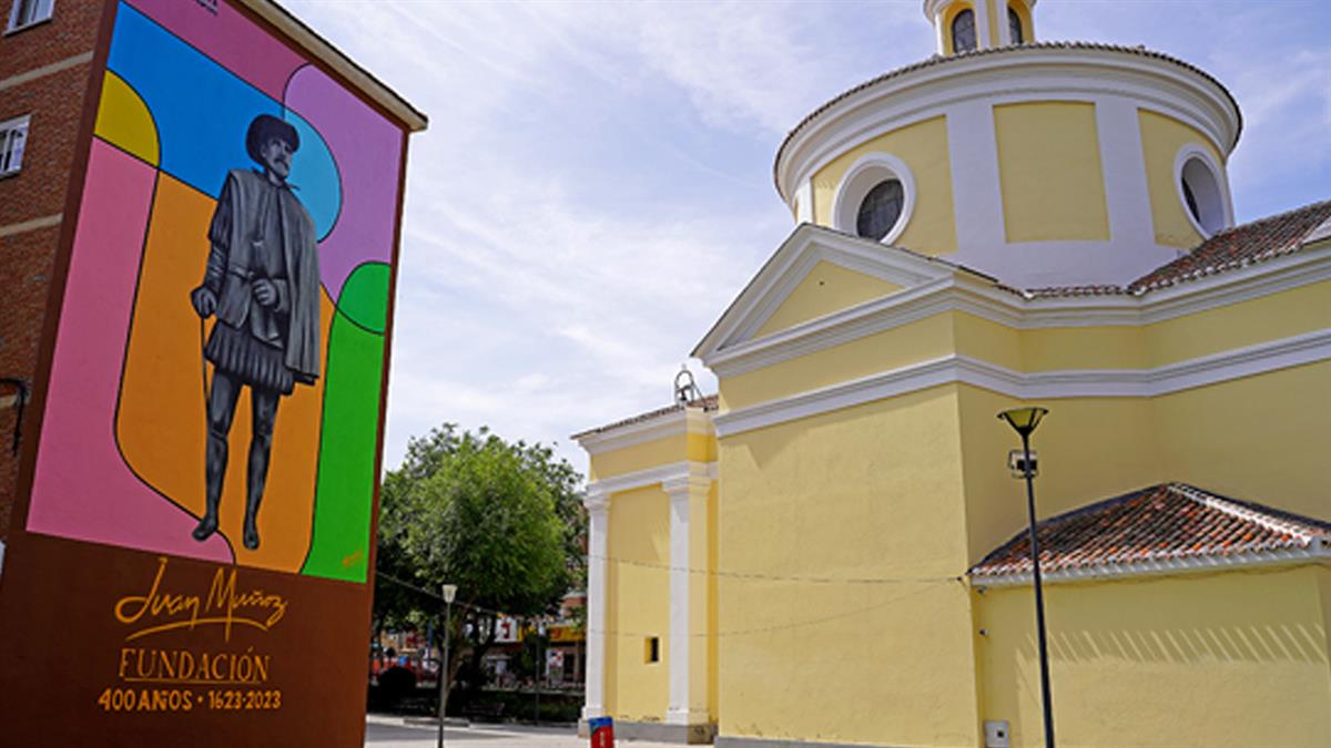 Leganés cuenta con un nuevo atractivo cultural, se ha estrenado, junto a la Iglesia de San Nicasio, un gran mural de 13 metros de alto por 7 de ancho para homenajear a la figura de Juan Muñoz y al papel de la Fundación Juan Muñoz en nuestra ciudad, institución que, en este 2023, cumple 400 años de vida.