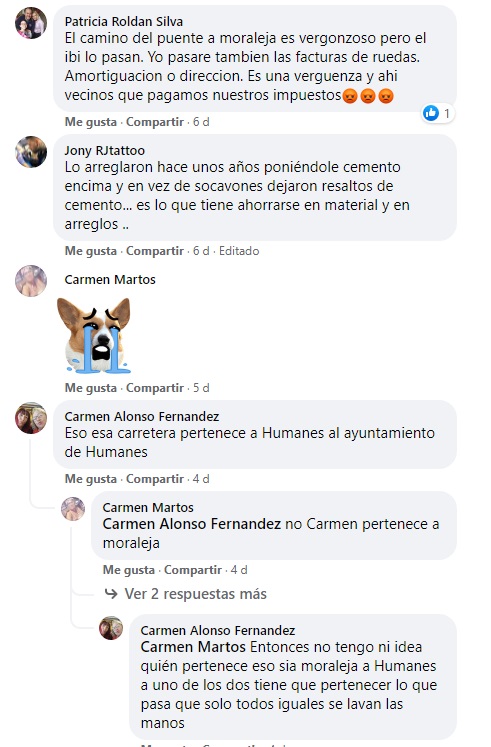 Tras esta publicación se desencadenaban numerosas contestaciones en las que nadie parecía estar del todo seguro de a qué Ayuntamiento compete la cuestión. Por otro lado, algunos vecinos se unían a la opinión de la publicación inicial alegando que "Lo arreglaron hace unos años poniendo cemento encima y en vez de socavones dejaron resaltos de cemento" y que "Lo jodido es de Moraleja y lo que está bien es lo de Humanes".