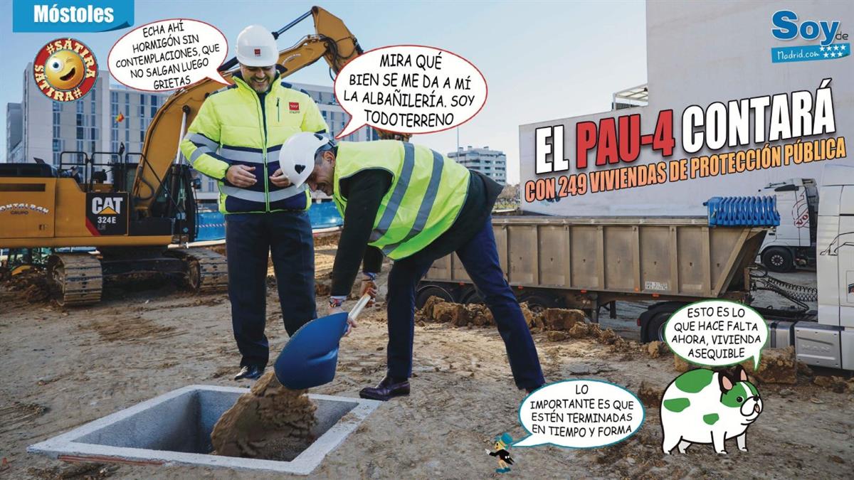 El alcalde de Móstoles, Manuel Bautista, y el consejero de Vivienda, Transportes e Infraestructuras de la Comunidad de Madrid, Jorge Rodrigo, han colocado de manera simbólica la primera piedra de las viviendas de protección pública en alquiler que se construirán en el PAU-4.