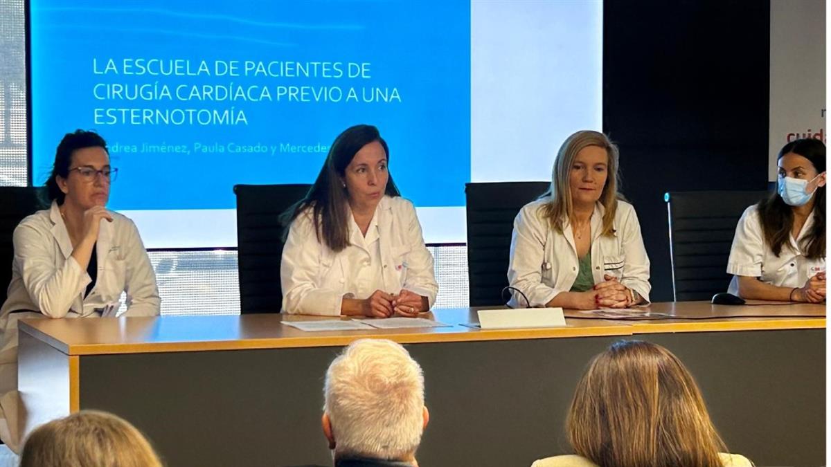 La escuela ofrece una sesión presencial con los pacientes a la que acuden un fisioterapeuta, un cirujano cardiaco y un enfermero de Hospitalización. Se inicia con una explicación por parte del cirujano sobre el proceso y el procedimiento. Por otro lado, también se hace un taller práctico de desinfección, movilización tras la cirugía y colocación de los dispositivos de soporte esternal, así como otro sobre los ejercicios respiratorios que se inician previamente a la cirugía y continúan tras la operación.