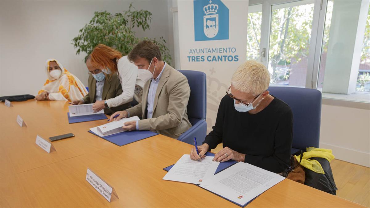 El alcalde, Jesús Moreno, y la presidenta de la Asociación de Amigos del Pueblo Saharaui de Tres Cantos, Carmen de Gregorio, han firmado un convenio por el cual el Ayuntamiento de Tres Cantos concede una subvención de 23.000 euros para ejecutar los proyectos del hermanamiento que mantiene con este organismo saharaui. A la firma también ha asistido la concejal de Familia e Igualdad, Sonia Lolo, el delegado, Alisalem Sidi Zein y la subdelegada, Jadiyet Elmohtar, del Frente Polisario en Madrid, así como los portavoces de los distintos grupos políticos y miembros de la Corporación Municipal.