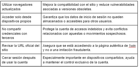 La siguiente tabla resume una serie de recomendaciones fundamentales para iniciar sesión en 1win de manera segura, rápida y sin interrupciones innecesarias: