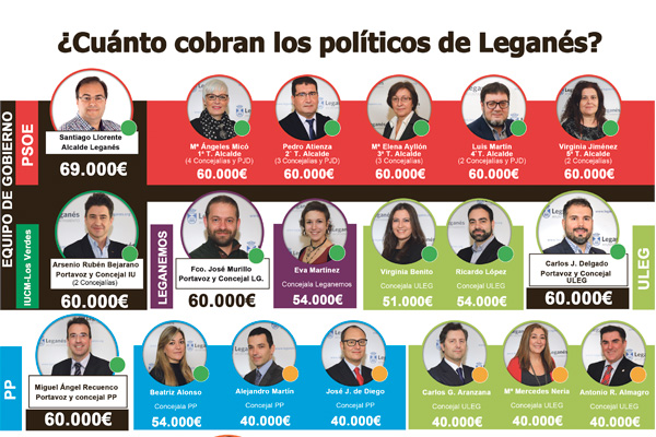 A cada leganense nos supone un gasto anual de 6,63€ pagar los sueldos de nuestros representantes municipales