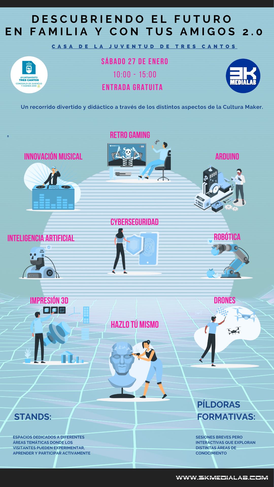 "Descubriendo el futuro: en familia o con tus amigos 2.0", de 10 a 15 horas, en la Casa de la Juventud, acogerá numerosos stands y actividades, además de píldoras formativas a modo de breves charlas para los asistentes.