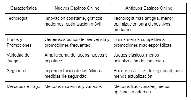 Comparación entre nuevos y antiguos casinos online Para entender mejor las diferencias y ventajas de los nuevos casinos online en Argentina, a continuación se presenta una tabla comparativa: