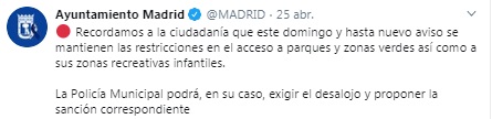 Muchos padres se han quejado de esta medida y han denunciado la información. En varios puntos de la capital han instado a salir a los progenitores con sus hijos. Opinan que esto es injusto ya que “si la orden permite poder ir a parques y espacios naturales de toda España,” no entienden por qué “aquí no podemos acceder”.