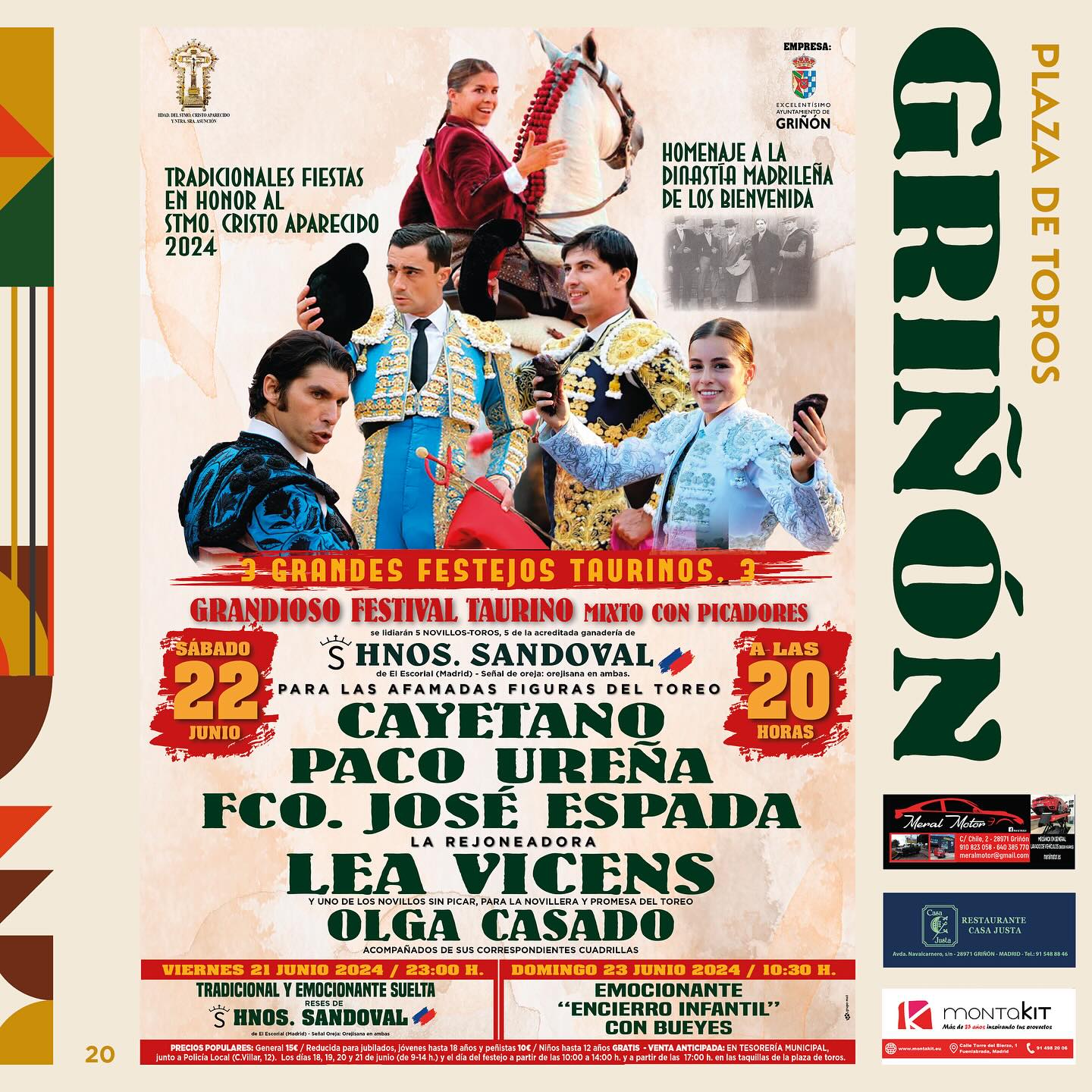 Con las Fiestas de Griñón, en honor al Santísimo Cristo Aparecido, a la vuelta de la esquina, desde el Ayuntamiento del municipio han anunciado que ya se pueden adquirir las entradas, tanto para el Festival Mixto con picadores del próximo sábado 22 de junio como para el Gran Prix del sábado 15 de junio.