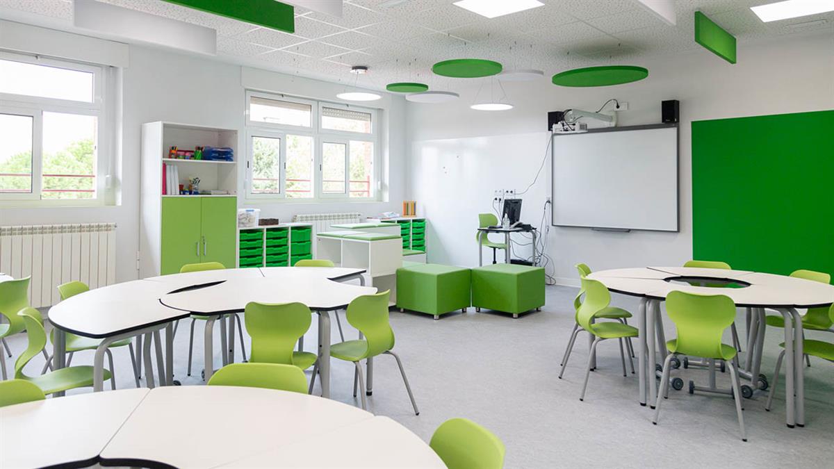 Cada espacio está pensado para crear una integración perfecta entre diseño funcional, sostenibilidad y aprendizaje, buscando siempre el confort de alumnos y profesores. Para ello, los materiales usados son reciclables, ignífugos, antibacterianos y autolimpiables.