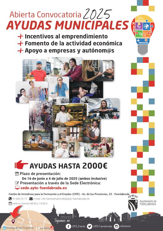 El plazo para presentar las solicitudes permanecerá abierto desde este lunes 16 de junio hasta el próximo 4 de julio. Deberán presentarse online a través de la Sede Electrónica del Ayuntamiento de Fuenlabrada https://sede.ayto-fuenlabrada.es/ en el apartado de CIFE, seleccionado ‘Ayuda fomento y apoyo al emprendimiento en Fuenlabrada’.