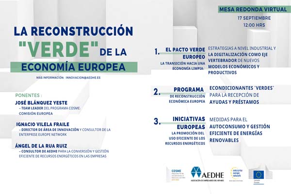 La Asociación de Empresarios del Henares (AEDHE) organizará, junto con el Parlamento Europeo, una Mesa Redonda en formato digital el día 17 de septiembre de este año. En ella hablarán sobre la “Reconstrucción Verde de la Economía Europea”, y contará con varios ponentes.