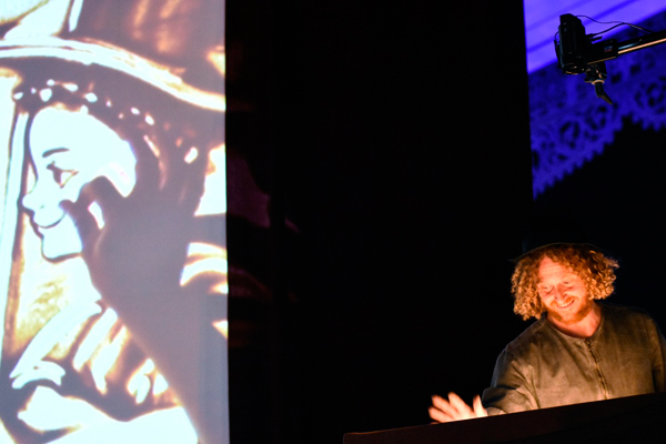 En la noche, la Plaza Cervantes también acogió Borja Gonzáles deleitó con su espectáculo “Sueños de Arena” a todos los alcalaínos, narrando el paso de dos personas en el transcurso de sus vidas mediante dibujos en la arena con sus propias manos.