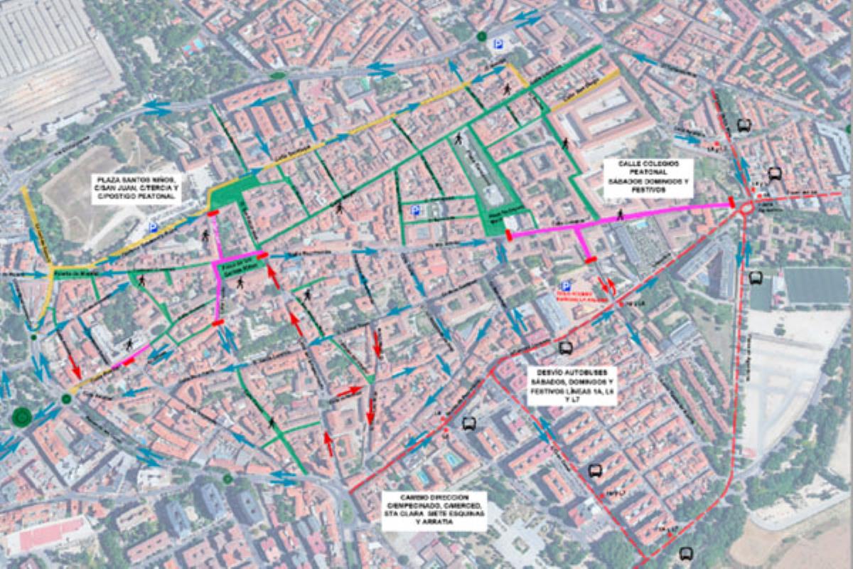 Como consecuencia de la peatonalización, el Ayuntamiento ha aprobado el cambio de sentido de circulación de las calles Empecinado, Santa Clara, La Merced, Siete Esquinas y Arratia, con el fin de mejorar la movilidad en la zona y favorecer la peatonalización sin perjuicio de la circulación de los vehículos.
