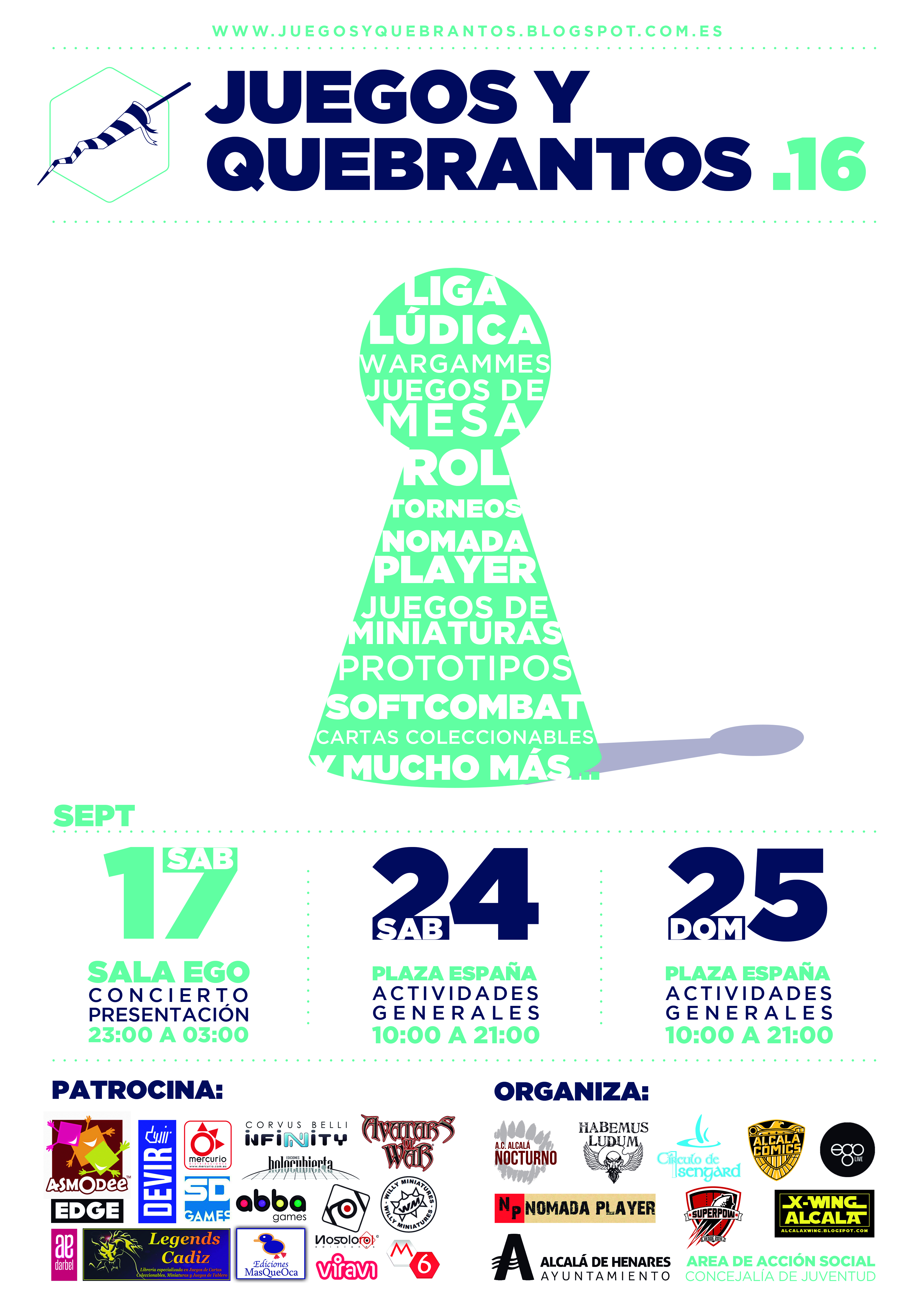 Las jornadas de ‘Juegos y Quebrantos.16.’ son una propuesta también para este fin de semana por parte del Programa OFM, un acto lúdico que recupera el movimiento de los aficionados a los juegos de rol, miniaturas, juegos de mesa, cartas y otros muhcos, todo organizado por AC Alcalá Nocturno, AC Circulo de Isengard, AC Habemus Ludum, Super Pow League, X-Wing Alcalá. Este evento tendrá lugar de 9:00 horas a 21:00 horas en la Plaza de España los dos días.