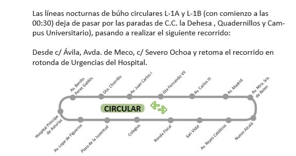 Las líneas nocturnas de búho circulares 1A y 1B (con comienzo a las 00:30 horas) dejan de pasar durante las Ferias por las paradas del Centro Comercial La Dehesa, Quadernillos y Campus Universitario, centrándose estos días en las zonas más próximas al casco urbano.