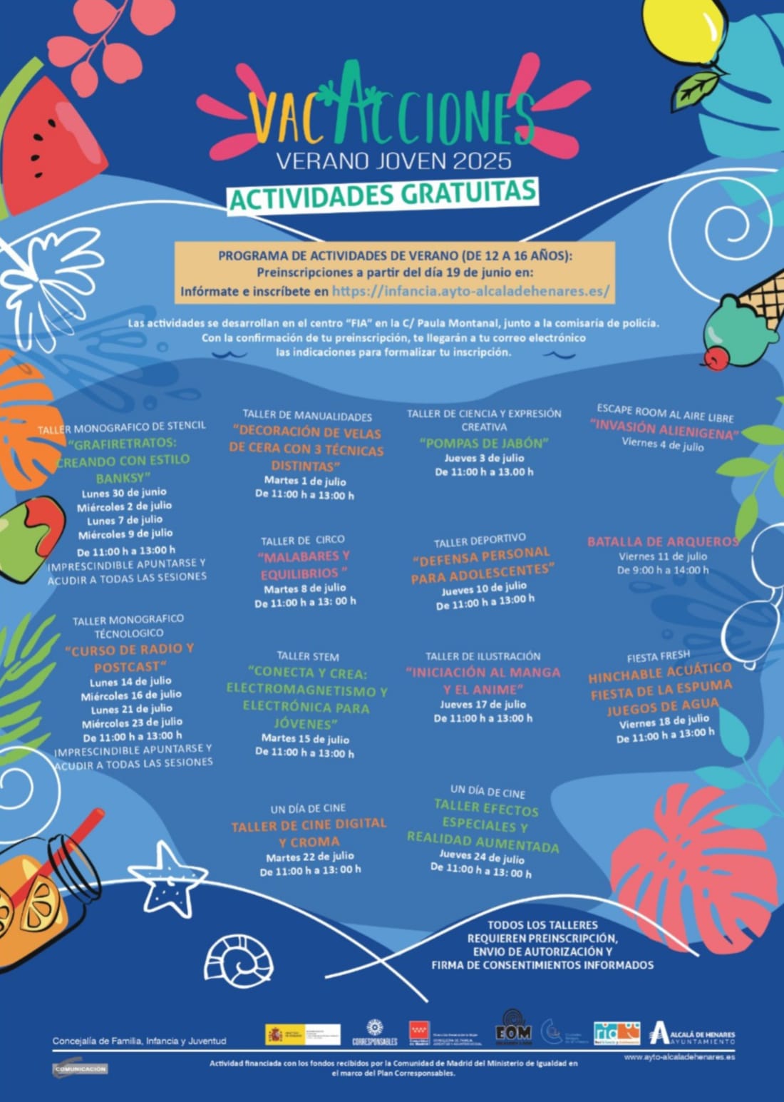 Las actividades, que se desarrollarán en el centro “FIA” en la C/ Paula Montal, contemplan talleres de pintura, de radio y podcast, de cine digital o efectos especiales y realidad aumentada, actividades de manualidades, de malabares, de electrónica, de pompas de jabón, de defensa personal, de iniciación al manga y al anime, el escape room, batalla de arqueros, o fiesta de la espuma y juegos de agua.