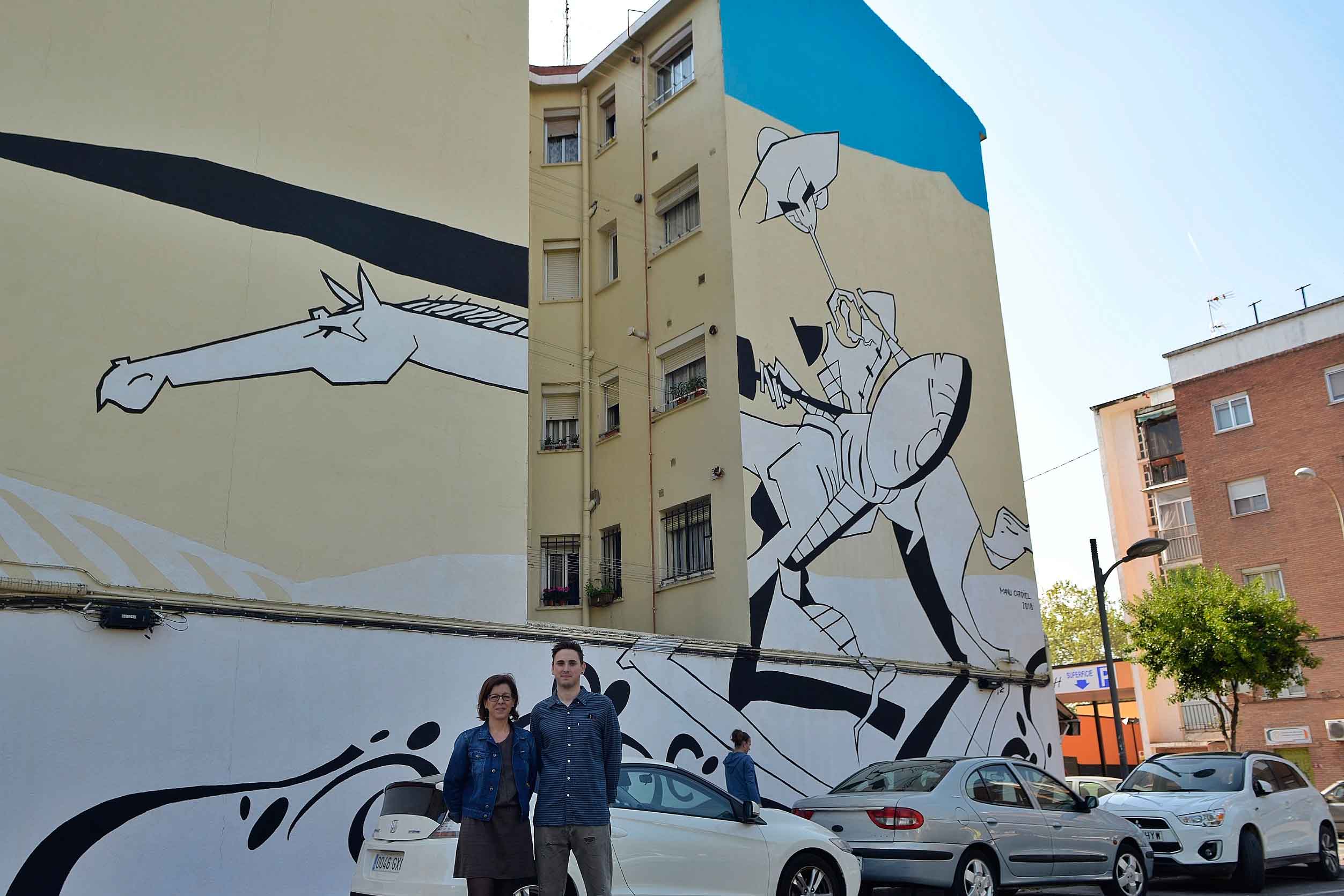 Los graffitis cervantinos siguen llenando de arte las fachadas de las calles de Alcalá. En esta ocasión ha sido el joven artista y arquitecto alcalaíno Manu Cardiel el autor del mural desplegado en cuatro fachadas ubicadas en las calles Torrelaguna y Gurugú.