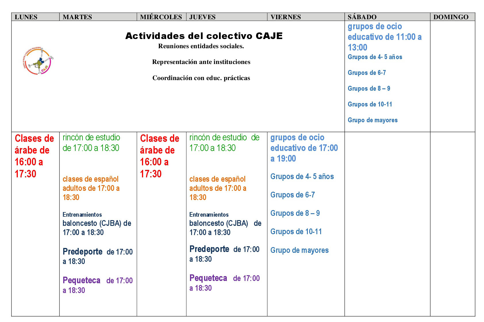 Horario actividades semanales / C.A.J.E.