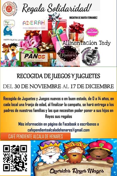 Café Pendiente Alcalá, página fundada por Julia Iniesta, y que colabora con la Asociación de enfermedades raras de Alcalá, tiene como objetivo involucrar a los vecinos y locales de nuestra ciudad en acciones solidarias. En este caso han organizado una campaña de recogida de juguetes bajo el lema “Regala Solidaridad”, del 30 de noviembre al 17 de diciembre, para recoger juguetes nuevos o de segunda mano, pero en buen estado, así como papel de regalo para poder envolver esos juguetes.