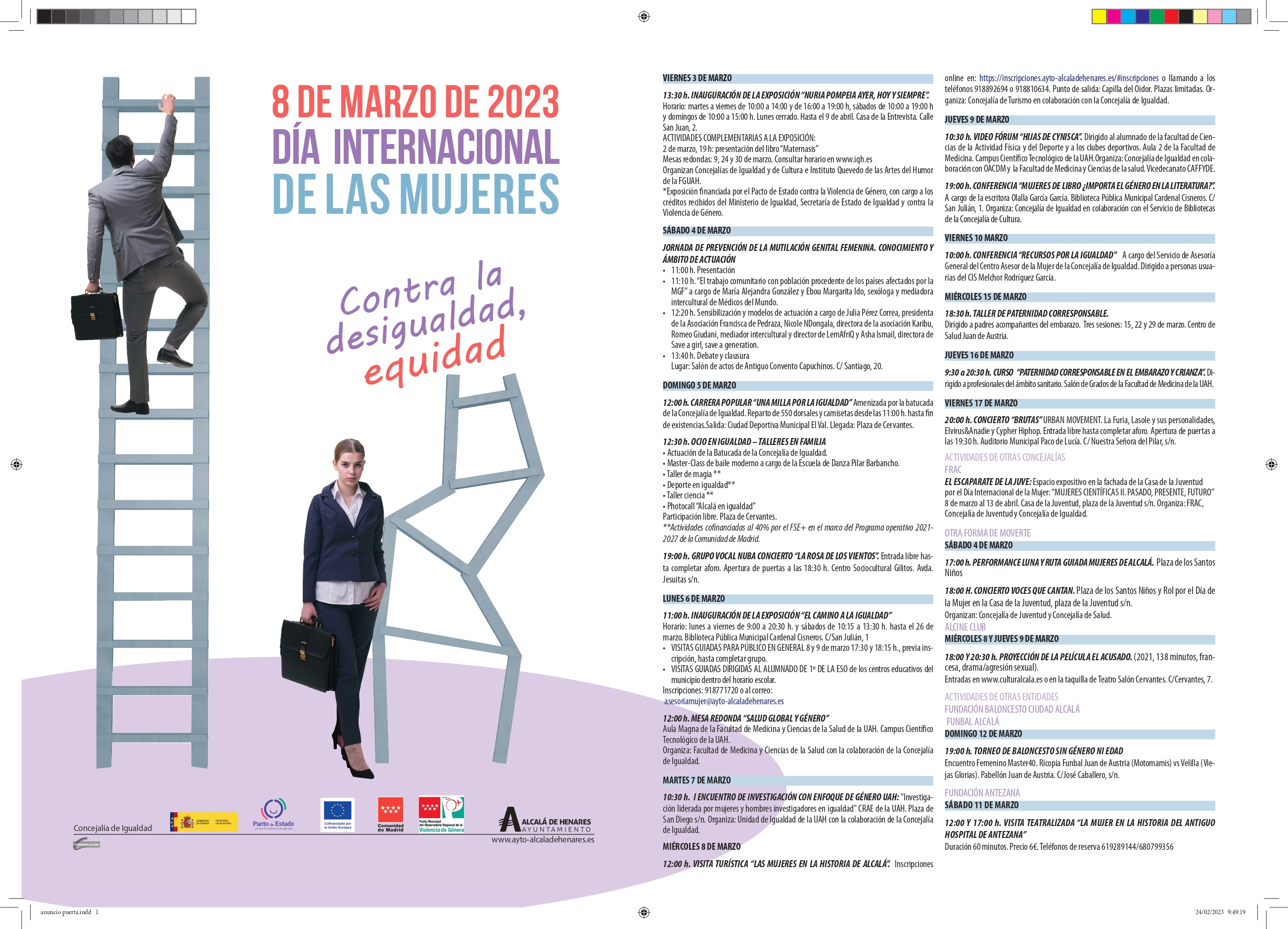 Para el Día de la conmemoración, el jueves 8 de marzo, se ha previsto, con la colaboración de la Concejalía de Turismo, una visita turística gratuita titulada “Las Mujeres en la Historia de Alcalá”, será necesaria la inscripción previa online en: https://inscripciones.ayto-alcaladehenares.es/#inscripciones o llamando a los teléfonos 918892694 o 918810634.