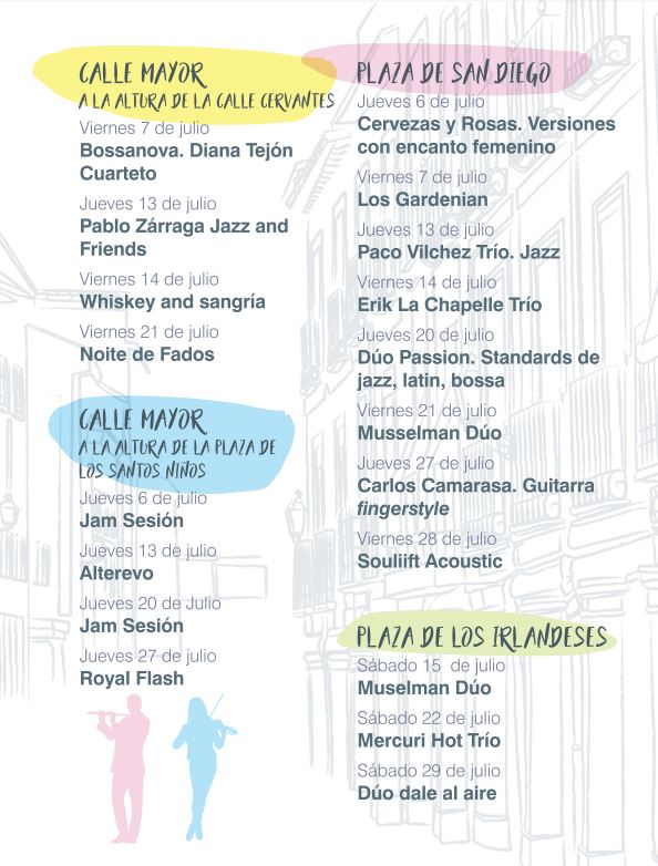 Este programa ya fue un éxito el año pasado, y este verano comienza con la misma ilusión. La concejal de Cultura y Turismo ha detallado los espacios en los que se llevará a cabo las actuaciones por parte de los grupos: en la Plaza de San Diego en la terraza del Hostel Complutum y la Terraza de El Bedel, en el Corral de la Sinagoga con la terraza del Whelan’s y la terraza de Tangú Restauración, en la Travesía de Avellaneda con la terraza del Imperial Craft Beer, y en la Plaza de los Irlandeses con la terraza Las Retintas.