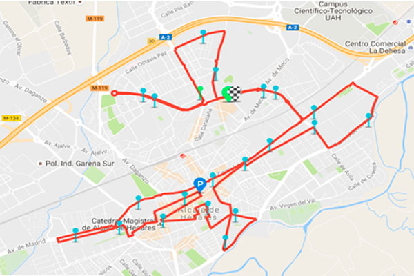 Salida 8:30 h.: Av. Miguel de Unamuno (Plaza de Toros) - Gta. de la Paz.-Avda. Miguel de Unamuno - Glorieta Vicente Alexandre - C/ Miguel de Unamuno- Gta. de la Paz - Avda. José Mª Pereda - Gta. de José Espronceda - C/ Octavio Paz - Avda. de los Jesuitas -Avda. Miguel de Unamuno - Gta. Lázaro Cárdenas - C/ Ávila - Gta. Puerta del Universo - Vía Complutense - C/ Varsovia - Camino de los Afligidos - Gta. calle Ávila con L. de Figueroa - C/ Ávila - Cº de la Engarabita - C/ Gil de Albornoz - C/ Diego de Urbina - Avda. Guadalajara - Plaza de los Mártires (Cuatro Caños) - C/ Azucena - C/ Giner de los Ríos - Gta. de Aguadores - C/ Fernán Falcón - Ronda del Henares - Gta. de Beleña - Pº de Aguadores - C/ Basilios - C/ Sto. Tomás de Aquino - C/ Colegios - Callejón S. Pedro y S. Pablo - Plaza de San Diego - C/ Bustamante de la Cámara - Plaza de Cervantes - Plaza de Rodríguez Marín - C/ Sta. Úrsula - C/ Escritorios - Plaza de los Santos Niños - C/ Mayor - Plaza Cervantes - C/ Libreros - C/ Nebrija - C/ Santiago - Plaza de Palacio - C/ San Juan - C/ Plaza de los Santos Niños - C/ Cardenal Cisneros - C/ Almazán - C/ Andrés Saborit - Av. Reyes Católicos - C/ Demetrio Ducas - Gta. Ciudad Patrimonio - Avda. del Ejército - C/ Alfonso de Alcalá - Av. Madrid - Gta. de 25 Villas - Gta. de Roca - Gta. de la Cruz Verde - Gta. de Jerónimo de Sola (San Isidro) - Vía Complutense - Gta. de Puerta del Universo - C/ Ávila - Gta. de Lázaro Cárdenas - Avda. Miguel de Unamuno.