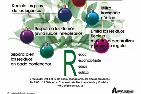 Alcalá de Henares vive este año una de las épocas más especiales del año, la Navidad. En esta época se disfrutan las tradicionales costumbres y es el momento de hacer regalos. Para poder aprovechar bien estas fiestas es necesario conocer algunos consejos para contribuir a proteger y mejorar nuestro entorno urbano y natural.