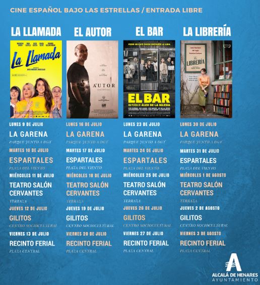 Esta noche, a partir de las 22:00 horas, Alcalá de Henares inaugura la nueva edición de "Alcine de verano", que llenará de historias la ciudad hasta el 3 de agosto. Este año contará con un nuevo espacio en la Garena, en el parque junto a las instalaciones de la DGT. Además, se mantienen la terraza del Teatro Salón de Cervantes, el Centro Sociocultural Gilitos, el recinto ferial y la plaza del viento de Espartales Norte.