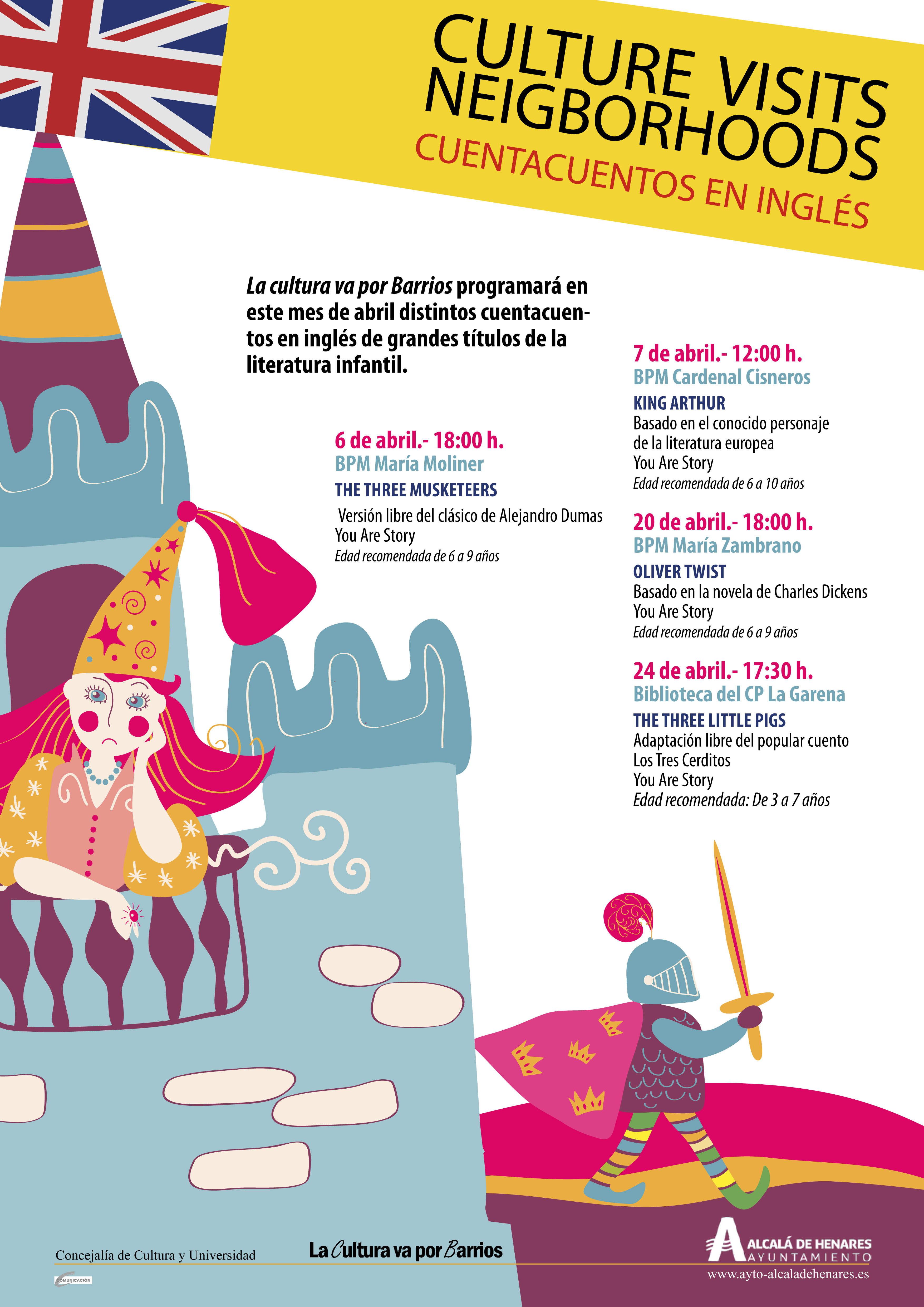 Este viernes, 6 de abril, comienza el ciclo en la Biblioteca Pública Municipal María Moliner a las 18 horas, con el espectáculo The Three Musketeers, una versión libre del clásico de Alejandro Dumas. Al día siguiente, sábado 7 de abril, será la Biblioteca Pública Municipal Cardenal Cisneros la que acoja a las 12 horas el cuento King Arthur, basado en el conocido personaje de la literatura europeo.