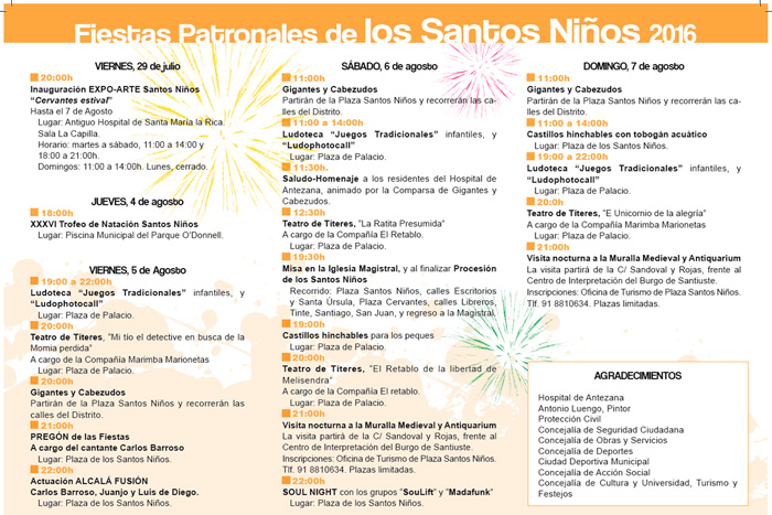 En este mismo emplazamiento, la Plaza de los Santos Niños, se celebrarán los conciertos de Carlos Barroso, Juanjo y Luis de Diego; que se celebrarán el viernes, mientras que el sábado se celebraran los conciertos de SouLift y Madafunk. La Plaza de Palacio, por su parte, congregará todas las actividades infantiles previstas en el programa de las Fiestas Patronales, tales como castillos, teatros y ludotecas.
