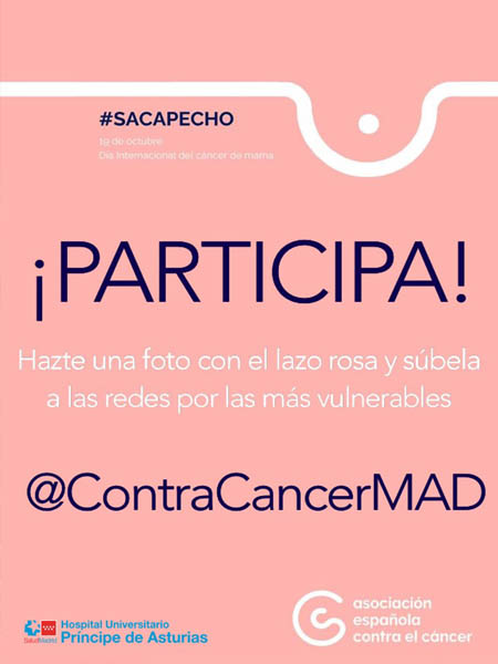 El Hospital Universitario Príncipe de Asturias (HUPA), de Alcalá de Henares, se adhirió la celebración del Día Internacional Contra el Cáncer de Mama. En colaboración con la campaña de la Asociación Española Contra el Cáncer, ha dispuesto una mesa informativa -atendida por voluntarios de esta asociación- junto a la entrada del centro y ha participado en la campaña #SACAPECHO en redes sociales para concienciar a la población sobre esta patología. El cáncer de mama es el tumor más frecuente detectado en la mujer y supone el 29,2% en la región en 2020, según el Registro de Tumores de Madrid, de ahí la importancia de un diagnóstico precoz.