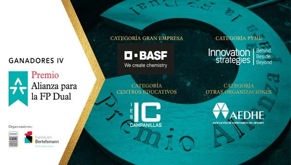 BASF ha sido la ganadora en la categoría de Gran Empresa por tener un proyecto de FP Dual que apuesta por la cooperación, ya que existe una continua transferencia de conocimiento y material docente entre la empresa y el centro formativo (Institut Comte de Rius), cuyos docentes realizan estancias en las plantas de la compañía en Tarragona y Alemania, y reciben clases de alemán. Además, el jurado ha valorado la calidad de su proyecto de FP Dual transnacional en el que la formación y el aprendizaje práctico se desarrollan en España y Alemania.