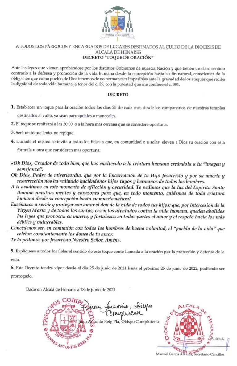 Así, el día 25 de cada mes las iglesias de Alcalá tocarán las campanas como muestra de su defensa por la vida, y a modo de "toque de oración". El obispo complutense explicaba que son "conscientes de la obligación que como pueblo de Dios tenemos de no permanecer impasibles ante la gravedad de los ataques que recibe la dignidad de toda vida humana", y animaba a explicar a la gente el por qué de esta medida, así como la propuesta de la siguiente oración: