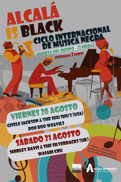 La sesión del viernes estará encabezada por la estadounidense Gisele Jackson y su banda The Shu Shu’s. La artista ha acompañado en sus giras a leyendas inigualables como James Brown, Donna Summer o Ray Charles. Fue la encargada de cantar en la toma de presidencia de Bill Clinton. Los artistas norteamericanos estarán acompañados en esta cita por los alcalaínos Boo Boo Weavils y sus propias composiciones de música Blues.
