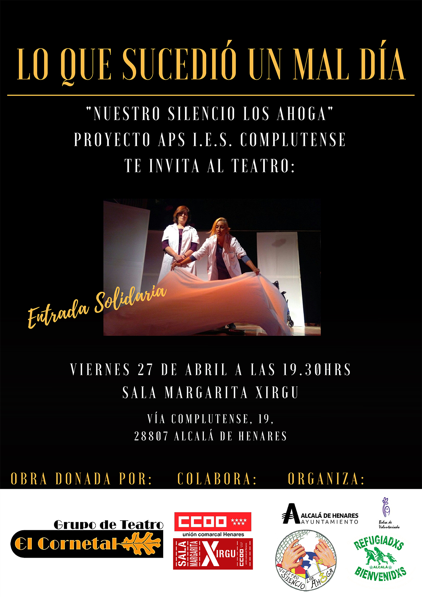 Los que huyen, los refugiados, nosotros, ellos... 'Lo que sucedió un mal día', la obra del grupo teatral El Cornetal, presenta su nueva muestra dentro del proyecto APS (aprendizaje - servicio solidario). Un trabajo organizado por Bienvenidos Refugiados Alcalá y el Í.E.S Complutense para que los alumnos que han querido participar en este tema puedan aprender la causa que mueve a esta asociación y el trabajo que se lleva a cabo desde "la comodidad de nuestras vidas" para sensibilizar a la gente y "hacer ver que los Derechos Humanos son cosa de todos y por eso en todas partes y a cualquier edad se puede hacer una grandísima labor".