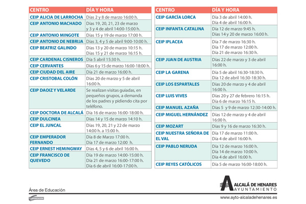 La Concejalía de Educación de Alcalá de Henares informa de la organización de Jornadas de Puertas Abiertas en los Centros de Educación Primaria de Alcalá de Henares.