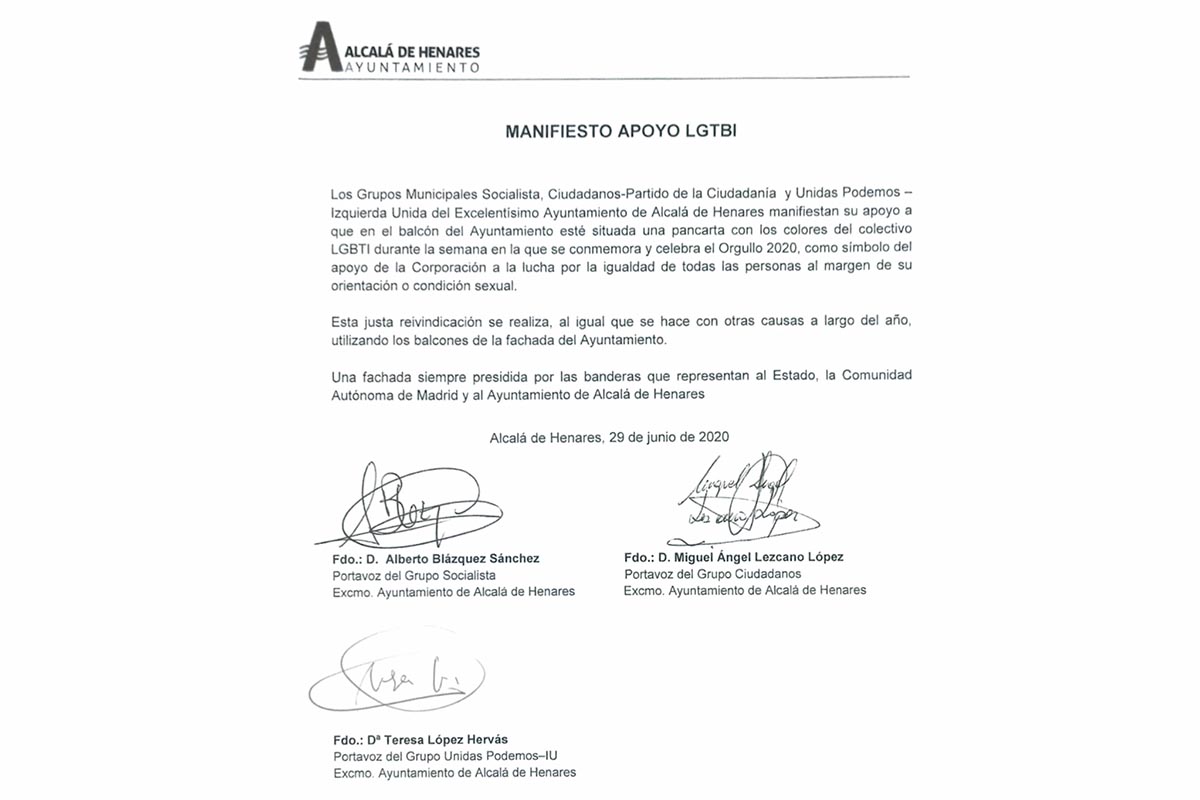 Durante la reunión se propuso la firmar de un Manifiesto, respaldado por los socialistas, Ciudadanos y Podemos-IU, en el que los tres Grupos manifiestan su “apoyo a que en el balcón del Ayuntamiento esté situada una pancarta con los colores del colectivo LGTBI durante la semana en la que se conmemora y celebra el Orgullo 2020, como símbolo del apoyo de la Corporación a la lucha por la igualdad de todas las personas al margen de su orientación o condición sexual”. El manifiesto concluye señalando que “esta justa reivindicación se realiza, al igual que se hace con otras causas a lo largo del año, utilizando los balcones de la fachada del Ayuntamiento. Una fachada siempre presidida por las banderas que representan al Estado, la Comunidad Autónoma de Madrid y el Ayuntamiento de Alcalá de Henares”.