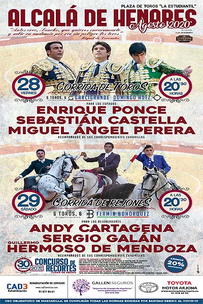 Además, Jorge Arellano hizo hincapié en las medidas de seguridad que iban a tomar, y recalcó que “aunque la Comunidad madrileña ha autorizado un aforo máximo del 75% en los festejos taurinos, nosotros hemos decidido reducirlo un poco más, y dejar el límite en 65% para poder garantizar la seguridad sanitaria, algo en lo que estamos muy implicados”, también añadió que la plaza de toros necesitaba un personal de 40/50 trabajadores, y ellos habían decidido doblarlas “con el fin de hacer cumplir todas las disposiciones. Igualmente, así como no estamos escatimando esfuerzos en la implementación del protocolo sanitario, estamos empeñados en hacer una campaña publicitaria importante, para que todos se enteren de que vuelven los toros a Alcalá y, además, con precios populares y descuentos importantes en los abonos generales, que serán del 20%, y del 30% si se trata de jubilados y jóvenes menores de 25 años, quienes también podrán acceder a un descuento del 15% si se trata de entradas sueltas para la corrida de toros y el festejo de rejones”. Incluso presentaron el spot con el que promocionarán la feria.