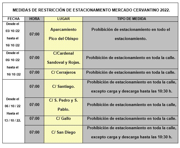 El Mercado Cervantino implicará importantes y necesarias restricciones de tráfico y estacionamiento en el entorno del Casco Histórico. Estas limitaciones se llevarán a cabo desde el jueves 6 hasta el jueves 13 de octubre, ambos incluidos.