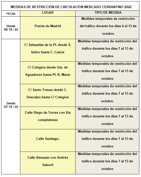 Como alternativa a esta restricción al tráfico de la calle Mayor, se permitirá que los vehículos de mercancías y reparto, realicen las operaciones de carga y descarga en la Plaza de los Santos Niños, Calle Tercia y calle Santiago. Estas operaciones de carga y descarga se deberán realizarse hasta las 10:30 horas, momento en el cual se inicia la actividad del Mercado Cervantino. A partir del 13 de octubre de 2022 se volverá al horario normal de carga y descarga en la calle Mayor entre las 8 y las 11h.