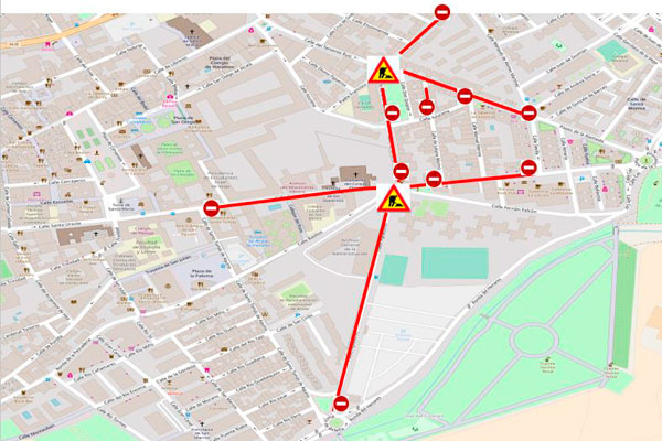 La Policía Local ha informado de que, durante los días 12 y 13 de julio, existirán restricciones de tráfico tanto en el transporte público como en el transporte privado en los accesos a las glorietas Ronda Ancha y glorieta de Aguadores.