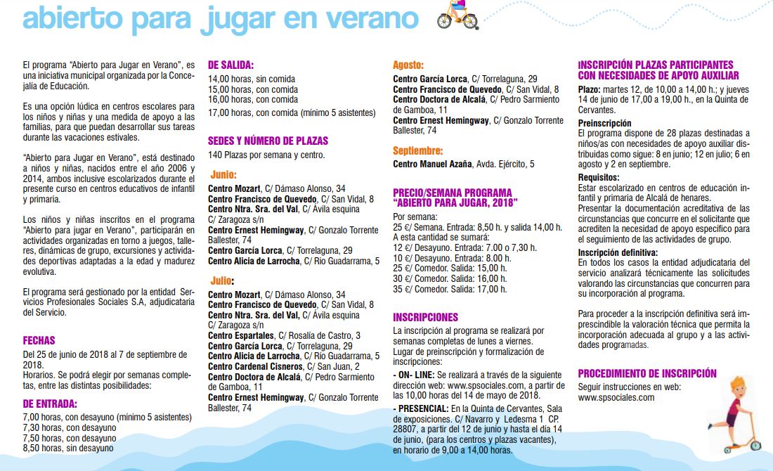 El programa "Abierto para Jugar en Verano" está destinado a niños y niñas escolarizados en centros de Infantil y Primaria. Entre las actividades organizadas podemos encontrar talleres, juegos, excursiones, deporte, dinámicas de grupo, excursiones y otra clase de actividades adaptadas a la edad y madurez.