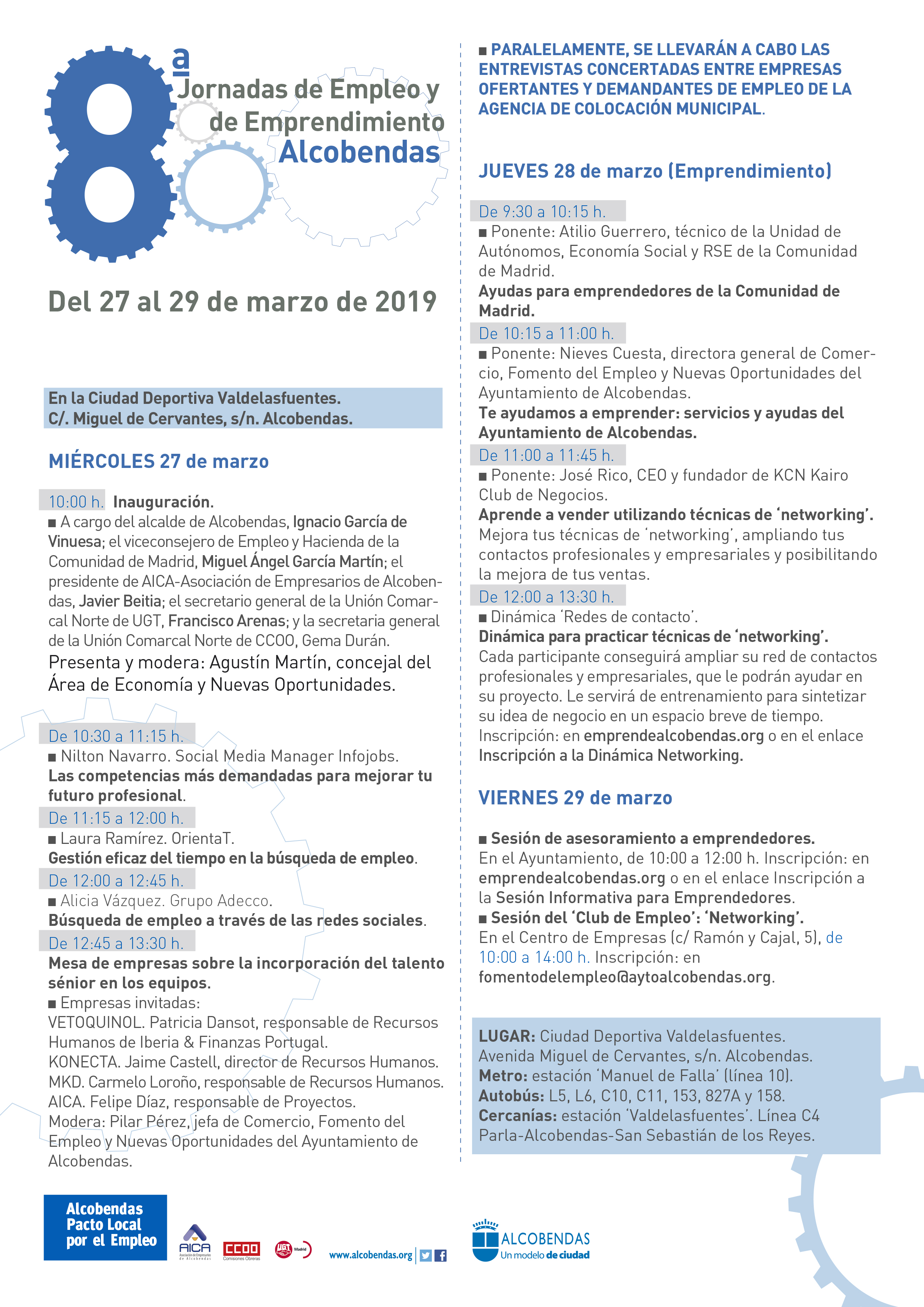 Las Jornadas de Empleo y Emprendimiento de Alcobendas celebran su octava edición este mes de marzo. Un total de 20 empresas participarán en este encuentro en el que tendrán lugar ponencias, mesas redondas, talleres o entrevistas de trabajo a candidatos seleccionados previamente por los técnicos de Empleo entre las personas inscritas en la Bolsa de Empleo, entre otras actividades. Las jornadas se realizarán en la Ciudad Deportiva Valdelasfuentes los días 27,28 y 29 de marzo