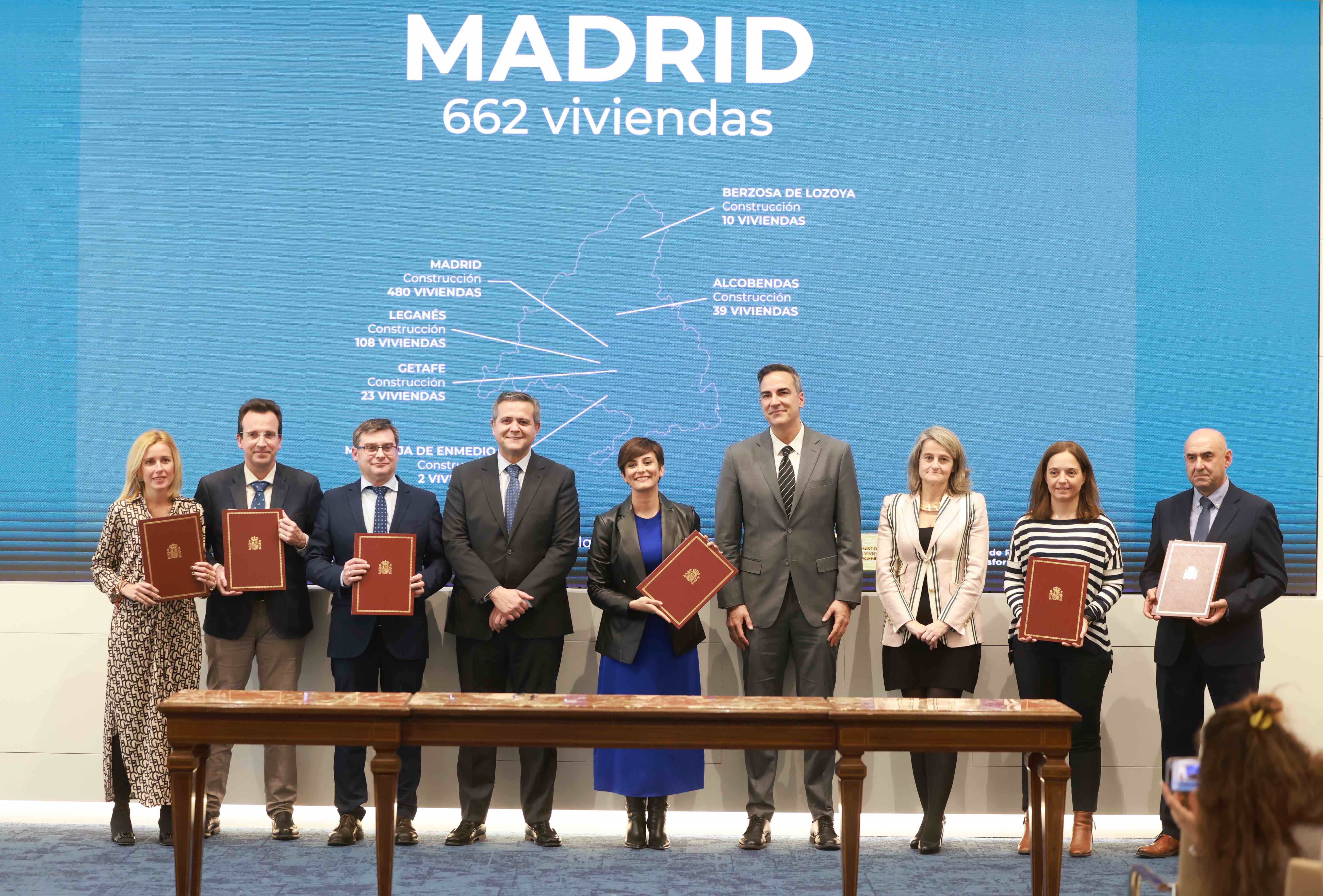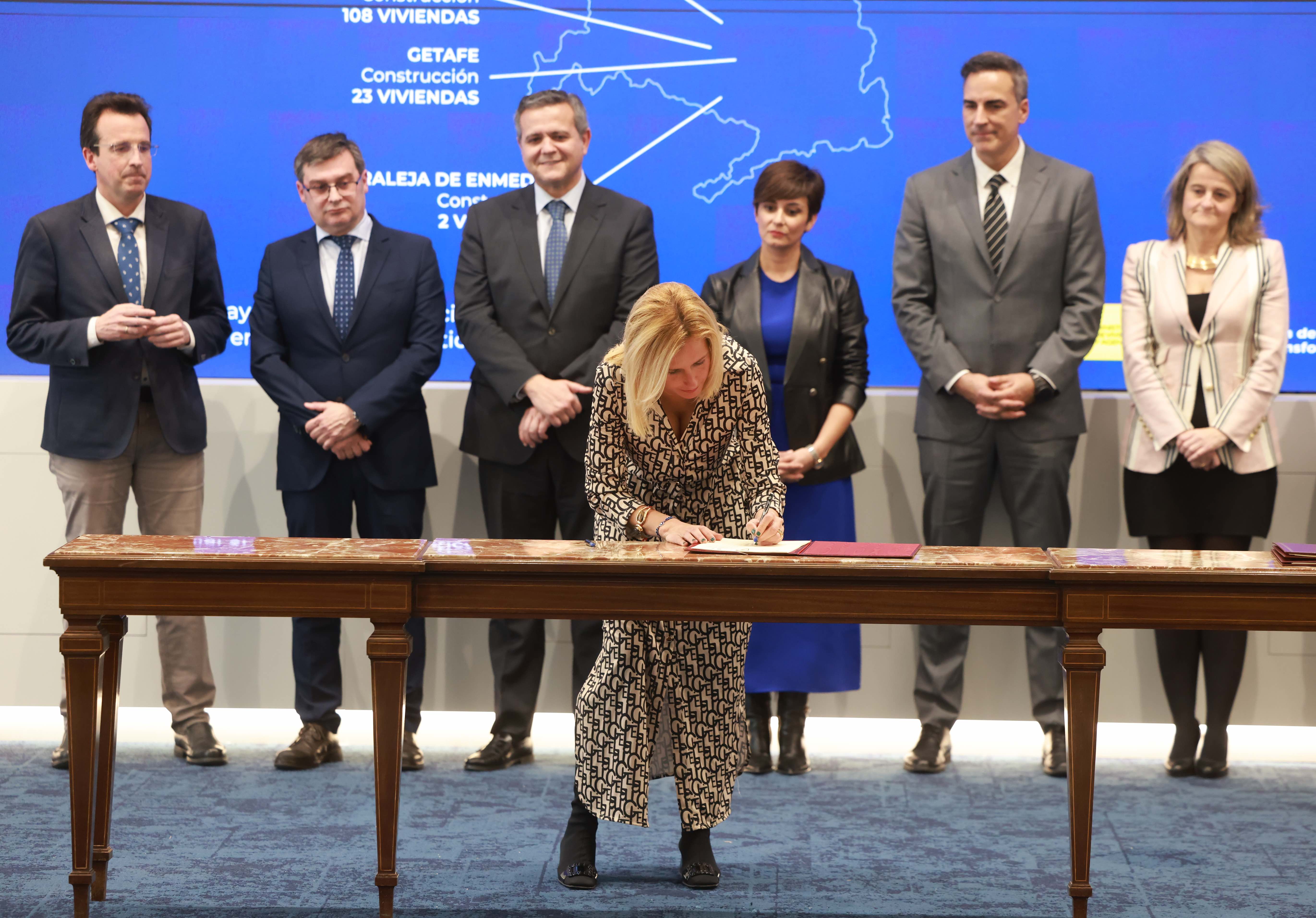 La alcaldesa de Alcobendas, Rocío García Alcántara, firmó el martes 19 de marzo el convenio junto al consejero de Vivienda, Transportes e Infraestructuras de la Comunidad de Madrid, Jorge Rodrigo, y el Ministerio de Vivienda, en cuya sede se ha celebrado esta rúbrica de impulso a la vivienda eficiente con fondos europeos a través del Plan de Recuperación, Transformación y Resiliencia (PRTR).